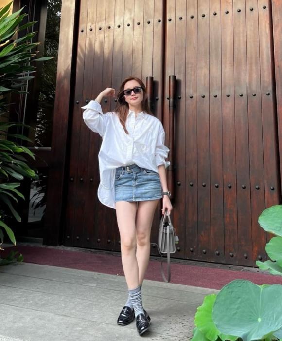 Cô nàng diện trang phục đơn giản với áo sơ mi và chân váy jeans khỏe khoắn. Nữ ca sĩ cũng khoe nhan sắc xinh đẹp, thần thái đầy tươi tắn khiến cư dân mạng không thể rời mắt. Bên cạnh đó, người đẹp cũng khéo léo phối hợp các phụ kiện để outfit dạo phố thêm phần năng động, trẻ trung.