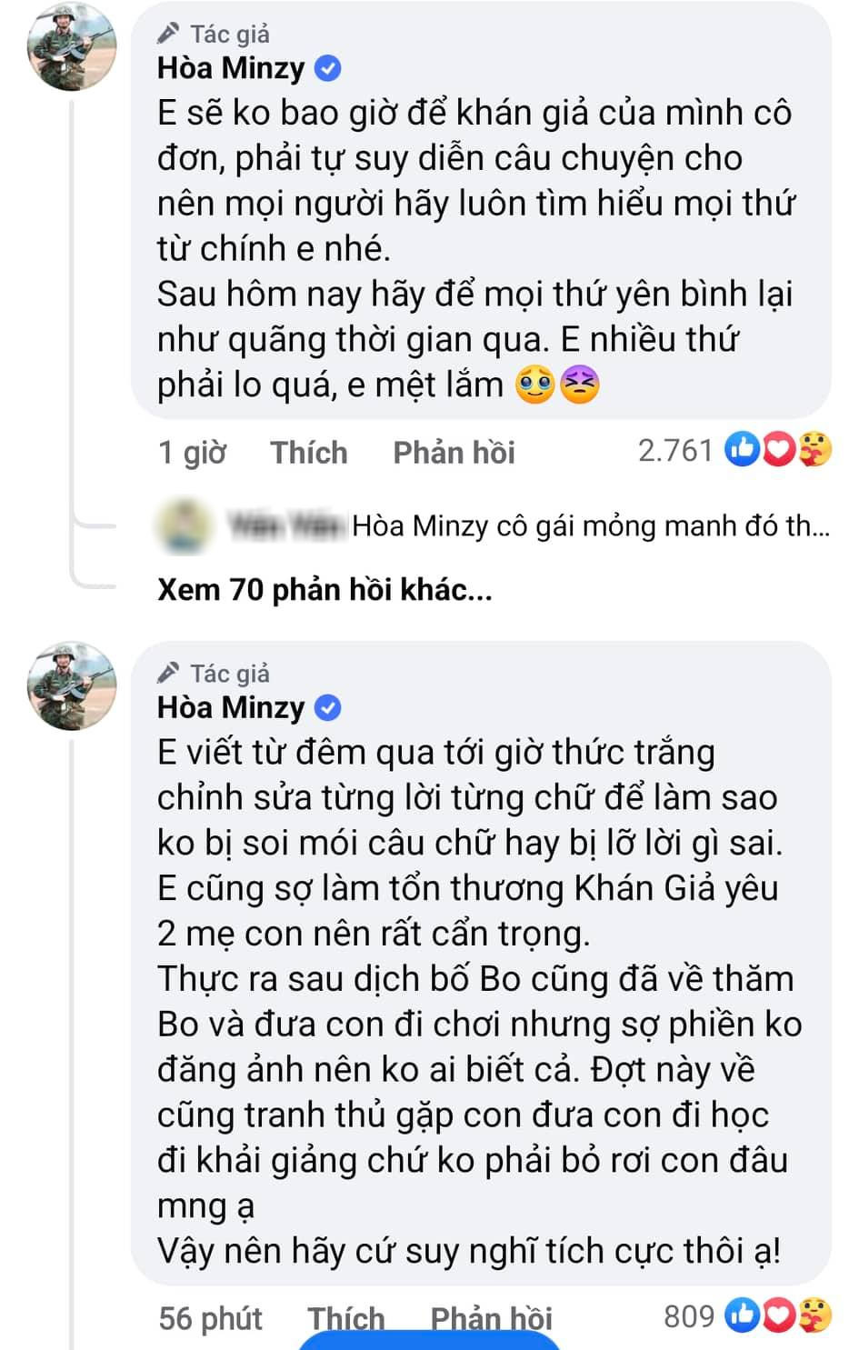 Sau khi hết dịch tôi về thăm con tôi bao nhiêu lần là tôi phải có nhiệm vụ đăng tải để báo cáo cho mọi người biết hay sao nhỉ? Từ ngày tôi và Hoà chính thức trở thành người bạn của nhau để cùng chăm con, tôi đã không còn muốn ồn ào, cho nên tôi không cần thiết phải khoe khoang việc yêu thương, chăm sóc hay thăm con cái cho quý vị vì tôi cũng chẳng cần nhiều tương tác chỉ vì đăng tải ảnh tình cảm của bố con tôi quá nhiều! Nên việc đăng tải hình ảnh để báo cáo cho các bạn không phải trách nhiệm của tôi nhé! Bởi vì có khoe thì các bạn cũng sẽ vẽ ra chuyện này chuyện kia rồi nói tôi giả tạo! Thế thì khoe làm gì? Tôi thế nào thì những người thân xung quanh tôi biết, không cần các bạn phải quan tâm hộ đâu ạ!