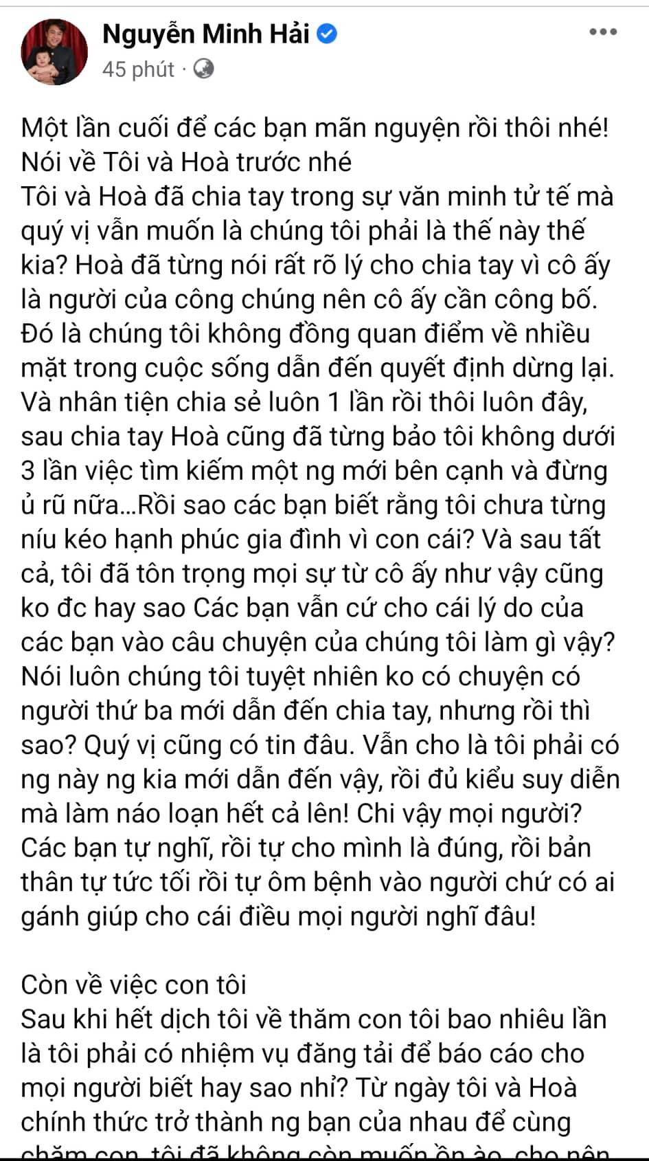 Tôi và Hoà đã chia tay trong sự văn minh tử tế mà quý vị vẫn muốn là chúng tôi phải là thế này thế kia? Hoà đã từng nói rất rõ lý cho chia tay vì cô ấy là người của công chúng nên cô ấy cần công bố. Đó là chúng tôi không đồng quan điểm về nhiều mặt trong cuộc sống dẫn đến quyết định dừng lại. Và nhân tiện chia sẻ luôn 1 lần rồi thôi luôn đây, sau chia tay Hoà cũng đã từng bảo tôi không dưới 3 lần việc tìm kiếm một người mới bên cạnh và đừng ủ rũ nữa… Rồi sao các bạn biết rằng tôi chưa từng níu kéo hạnh phúc gia đình vì con cái? Và sau tất cả, tôi đã tôn trọng mọi sự từ cô ấy như vậy cũng không được hay sao Các bạn vẫn cứ cho cái lý do của các bạn vào câu chuyện của chúng tôi làm gì vậy?