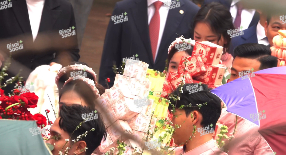 Sáng 15/1, hội ăn cưới online chấm hóng từng phút để theo dõi diễn biến trong lễ ăn hỏi của Á hậu Phương Nhi và chồng thiếu gia. Vào đúng 8 giờ sáng, công tác chuẩn bị ở nhà cô dâu đã hoàn tất, đoàn xe nhà trai cũng xuất hiện. Doanh nhân Phạm Nhật Minh Hoàng - con trai thứ 2 của tỷ phú Phạm Nhật Vượng diện áo dài truyền thống, khuôn mặt hào hứng thấy rõ khi rước nàng về dinh. Trong các ngày trọng đại của sao Việt, ngoài cô dâu và chú rể thì chi tiết được chú ý không kém chính là dàn sính lễ.