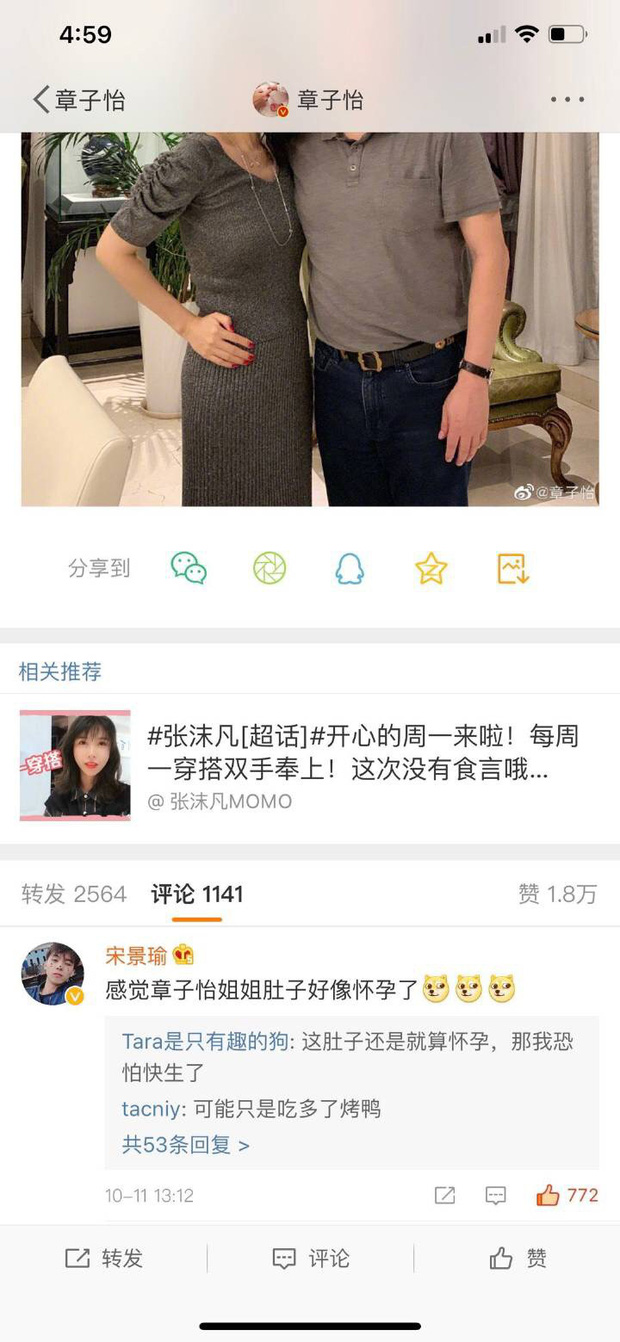 Mặc dù đến tận tháng thứ 7 mới chính thức thừa nhận, nhưng trước đó cư dân mạng đã tinh mắt phát hiện ra dấu hiệu mang thai của Chương Tử Di khi bụng cô còn chưa lộ rõ, sau bài đăng thừa nhận này của chính chủ, dân mạng liền "đào mộ" lại những bình luận trước đó trong không khí phấn khởi.
