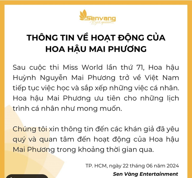 Chiều 22/6, phía công ty chủ quản Sen Vàng đã chính thức lên tiếng thông tin về Hoa hậu Mai Phương: "Sau cuộc thi Miss World lần thứ 71, Hoa hậu Huỳnh Nguyễn Mai Phương trở về Việt Nam tiếp tục việc học và sắp xếp những việc cá nhân.