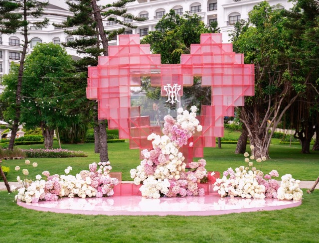 Trước giờ G, qua hình ảnh do MC Nguyên Khang hé lộ, điểm nhấn của buổi lễ là thiết kế trái tim màu hồng với chữ “H-T” - viết tắt tên Hồ Quỳnh Hương và Hoàng Công Thành, được đặt trang trọng giữa sân khấu.