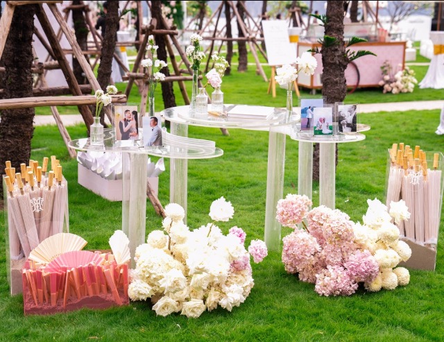 Không chỉ thế, Hồ Quỳnh Hương còn dùng 5 tấn hoa tươi gồm mẫu đơn, hồ điệp, tulip, trang trí trong tiệc cưới. Được biết, toàn bộ vật dụng bài trí đều dựa trên ý tưởng của ca sĩ. Cô mong muốn ngày cưới mang không khí lãng mạn nên chọn màu chủ đạo trắng, hồng.