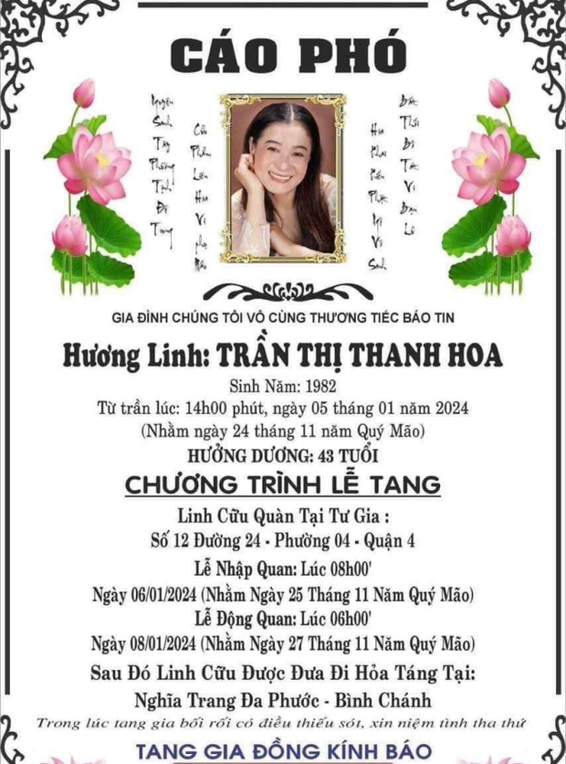 06/01/2024 13:41Thông tin tang lễ của 'Thanh Sói' Thanh Hoa: Hé lộ thời gian và địa điểm, linh cữu được hỏa táng