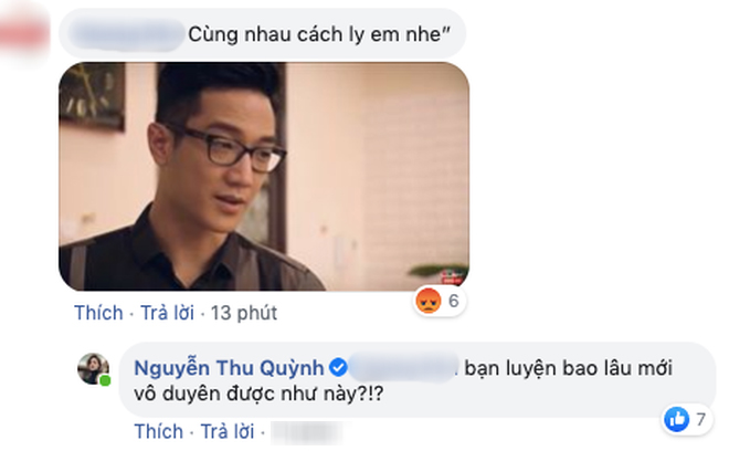 Không giống như những bình luận khác chỉ thả tim hay nhấn like, Thu Quỳnh đã thẳng thừng lên tiếng đáp trả lời bông đùa kém duyên này: "Bạn luyện bao lâu mới vô duyên được như vậy". Phản ứng này của nữ diễn viên đã nhận được nhiều sự đồng tình từ khán giả.