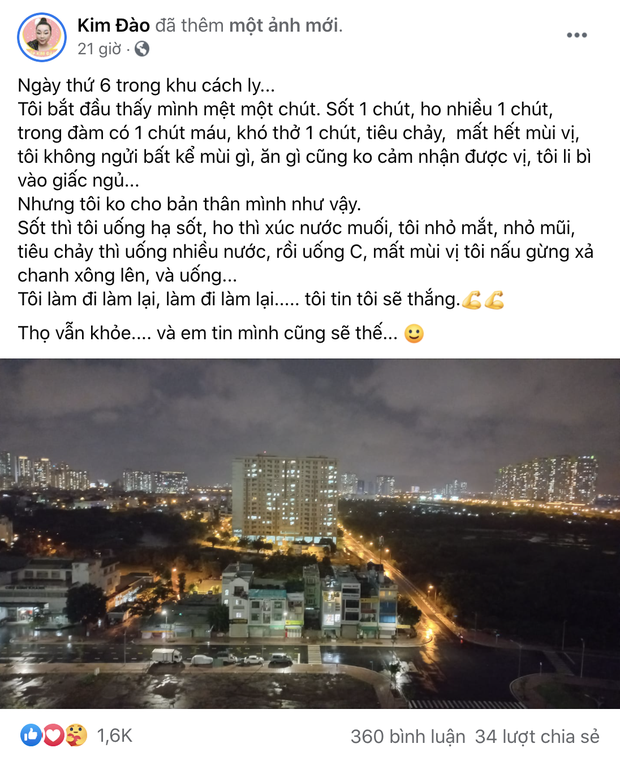Trong bài đăng vào tối 17/7, cô chia sẻ: "Ngày thứ 6 trong khu cách ly. Tôi bắt đầu thấy mình mệt một chút. Sốt 1 chút, ho nhiều 1 chút, trong đàm có 1 chút máu, khó thở 1 chút, tiêu chảy, mất hết mùi vị, tôi không ngửi bất kể mùi gì, ăn gì cũng không cảm nhận được vị, tôi li bì vào giấc ngủ... Nhưng tôi không cho bản thân mình như vậy.