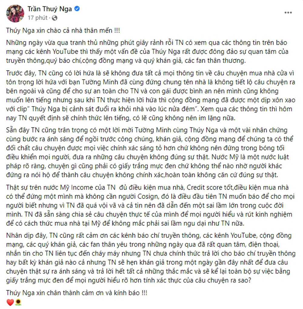 Sau gần một tuần trôi qua, mới đây, Thúy Nga đã có bài đăng chính thức lên tiếng trên trang cá nhân về sự việc.