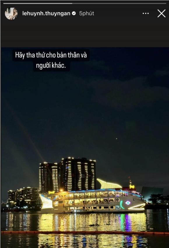 Vào ngày 26/11 vừa qua, Thúy Ngân tiếp tục có chia sẻ đầy ẩn ý trên trang cá nhân. Nữ diễn viên đăng tải hình ảnh chụp phong cảnh vào buổi tối và đính kèm dòng chú thích tâm trạng: "Hãy tha thứ cho bản thân và người khác".