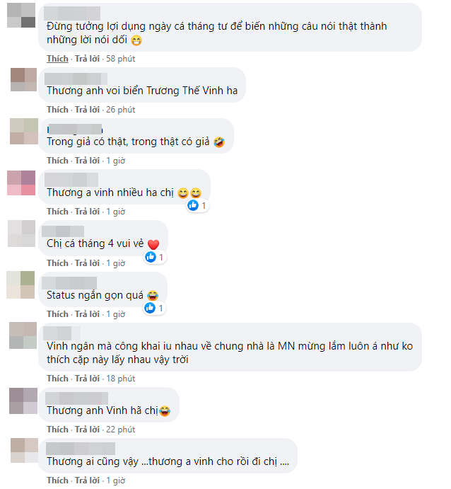 Ngay lập tức, dân tình liền gọi tên Trương Thế Vinh - "bạn trai tin đồn" của Thúy Ngân chính là nhân vật được nữ diễn viên bày tỏ tình cảm. Mặc dù hôm nay là ngày "cá tháng tư" (ngày nói dối) nhưng người hâm mộ vẫn cho rằng Thúy Ngân đang mượn ngày này để thổ lộ tình cảm thật sự. Đặc biệt là những ai yêu thích cặp đôi Trương Thế Vinh - Thúy Ngân lại càng được phen "đẩy thuyền" mạnh hơn.