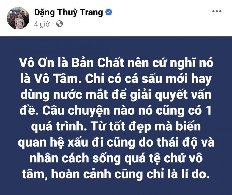 Giữa lúc ồn ào vẫn chưa hạ nhiệt, Đặng Thùy Trang - chị gái Hoa hậu Đặng Thu Thảo, người có hiềm khích với Thùy Tiên suốt nhiều năm nay - đã có bài viết đầy ẩn ý trên trang cá nhân. Cụ thể, người này viết: "Vô ơn là bản chất nên cứ nghĩ nó là vô tâm. Chỉ có cá sấu mới hay dùng nước mắt để giải quyết vấn đề. Câu chuyện nào nó cũng có một quá trình. Từ tốt đẹp mà biến quan hệ xấu đi cũng do thái độ và nhân cách sống quá tệ chứ vô tâm, hoàn cảnh cũng chỉ là lý do".