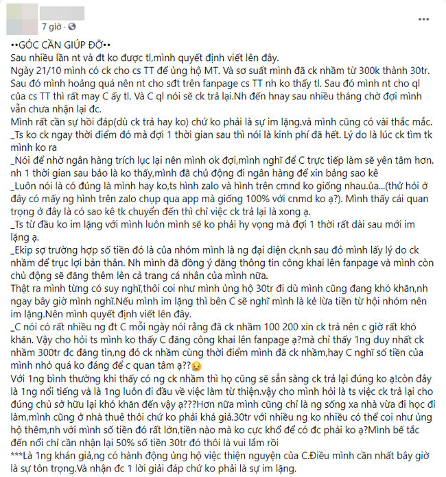 Mới đây, một cư dân mạng có tài khoản Facebook T.H đã đăng bài bày tỏ sự thắc mắc về chuyện chuyển nhầm tiền ủng hộ miền Trung cho Thủy Tiên nhưng mãi chưa được nhận lại.
