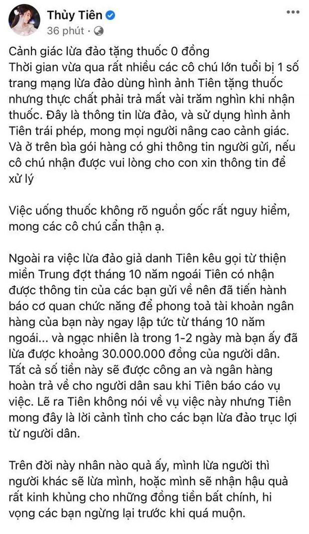 Và ngạc nhiên là trong 1-2 ngày mà bạn ấy đã lừa được khoảng 30.000.000 đồng của người dân. Tất cả số tiền này sẽ được công an và ngân hàng hoàn trả về cho người dân sau khi Tiên báo cáo vụ việc. Lẽ ra Tiên không nói về vụ việc này nhưng Tiên mong đây là lời cảnh tỉnh cho các bạn lừa đảo trục lợi từ người dân".