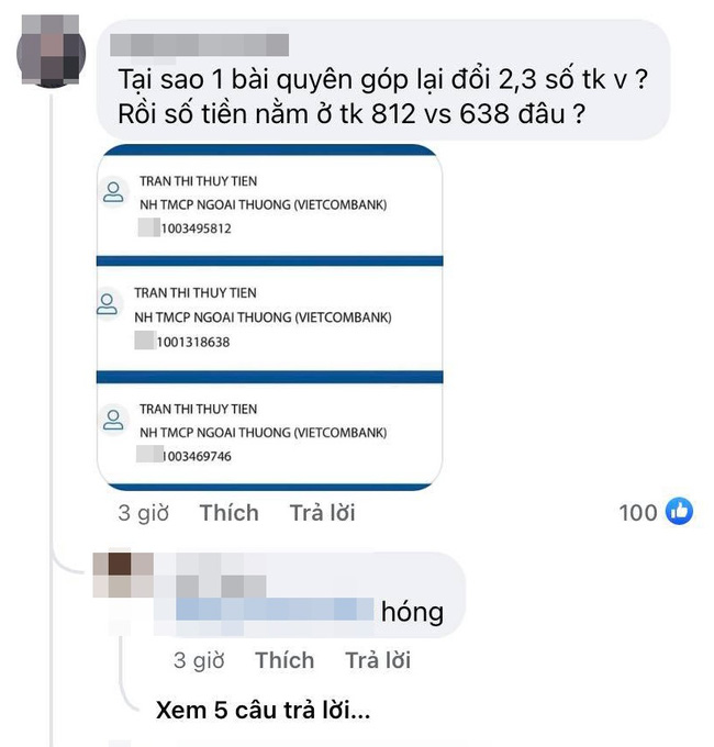 Người này cho biết: "Nếu chị đã nói sao kê minh bạch thì phải sao kê 3 tài khoản. Vì trong mỗi bài viết kêu gọi, chị đều để tài khoản khác nhau. Tiền chị nhận vào là 3 tài khoản. Nhưng chị lại sao kê 1 tài khoản. Vậy thì 2 tài khoản còn lại dòng tiền đó chảy về đâu".