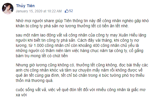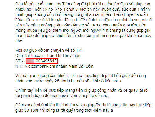 Tuy nhiên, cũng có một số người chỉ ra rằng, trong bài đăng ngày 15/1/2020 Thủy Tiên sử dụng số tài khoản đuôi 746 để kêu gọi giúp đỡ công nhân gặp khó khăn. Nhưng sau đó nữ ca sĩ đã chuyển sang dùng số tài khoản đuôi 812 cho quỹ giúp đỡ công nhân.