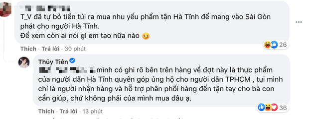 Không chỉ Công Vinh, Thuỷ Tiên cũng phân trần thêm: "Mình có ghi rõ trên hàng về đợt này là thực phẩm của người dân Hà Tĩnh quyên góp ủng hộ cho người dân TP.HCM. Tụi mình chỉ là người nhận hàng và hỗ trợ phân phối hàng đến tận tay cho bà con cần giúp chứ không phải của mình mua đâu".