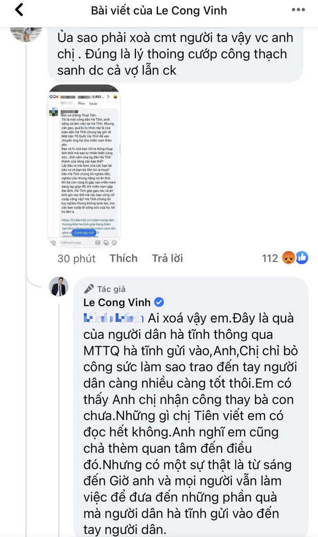 Trước những bức xúc của dân mạng, Công Vinh chính thức lên tiếng giải thích trực tiếp với antifan: "Đây là quà của người dân Hà Tĩnh thông qua Mặt trận Tổ quốc (MMTQ) Hà Tĩnh gửi vào. Anh, chị chỉ bỏ công sức làm sao trao đến tay người dân càng nhiều càng tốt thôi. Em có thấy anh chị nhận công thay bà con chưa. Những gì chị Tiên viết em có đọc hết không. Anh nghĩ em cũng chả thèm quan tâm đến điều đó. Nhưng có một sự thật là từ sáng đến giờ anh và mọi người vẫn làm việc để đưa đến những phần quà mà người dân Hà Tĩnh gửi vào đến tay người dân".