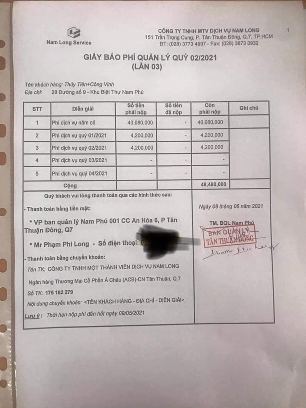 Tính cả 2 quý 1 và quý 2 của năm 2021 (chưa đóng), Thủy Tiên còn xấp xỉ 49 triệu tiền phí dịch vụ chưa thanh toán. Đáng nói là, hạn hoàn thành phí đáng lẽ là ngày 9/5/2021, nhưng 1 tháng sau đó, dù đã nhắc 2 lần, phía làm dịch vụ vẫn chưa thu được phần tiền này từ Thủy Tiên.