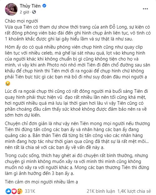 Chuyện chỉ đơn giản là như vậy nên Tiên mong mọi người nếu thương Tiên thì đừng tấn công các bạn ấy và nhãn hàng các bạn ấy đang quảng cáo ạ. Bản thân Tiên đã từng bị tấn công vào các nhãn hàng mình đang hợp tác như thời gian qua cũng đã thật sự là rất mệt mỏi... nên rất là chia sẻ với các bạn ấy về vấn đề này ạ.
