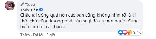 - "Thủy Tiên muốn giải thích dùm là việc của Tiên. Mọi người thấy bức xúc thì mọi người có quyền lên tiếng, không thể không lên tiếng được. Biết là dĩ hoà vi quí, nhưng hiền quá là bị người ta leo lên đầu ngồi liền. Cái thái độ trịch thượng với tiền bối, cử chỉ kém duyên kém sang , ánh mắt liếc nhìn đó tất cả mọi người đều nhìn thấy rõ ràng như ban ngày. Kêu im thì làm sao im được".