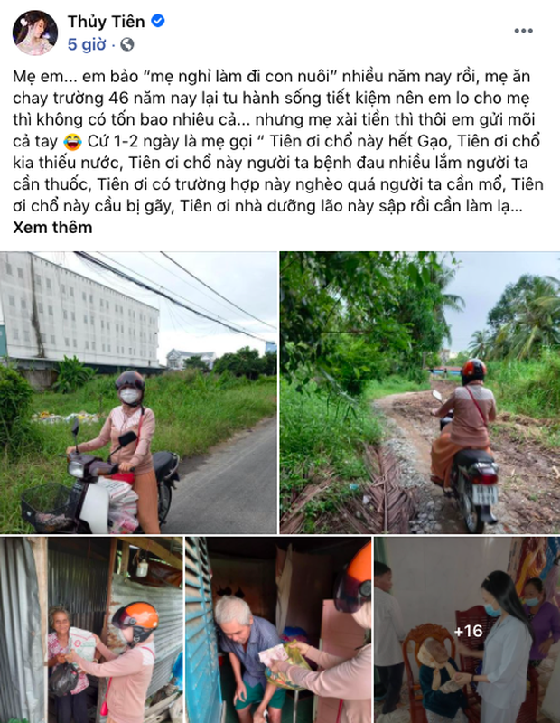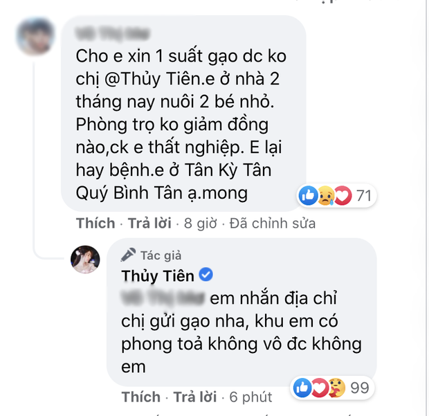 Đến buổi tối cùng ngày, Thuỷ Tiên đã có động thái gây chú ý giữa lùm xùm này. Dưới bài đăng khoe mẹ đi làm từ thiện của nữ ca sĩ, một fan đã để lại bình luận xin gạo vì hoàn cảnh vô cùng khó khăn. Không đả động gì đến lùm xùm, giọng ca 8x trả lời đầy thiện chí: "Em nhắn địa chỉ chị gửi gạo nha, khu em có phong toả không, vô được không em?".