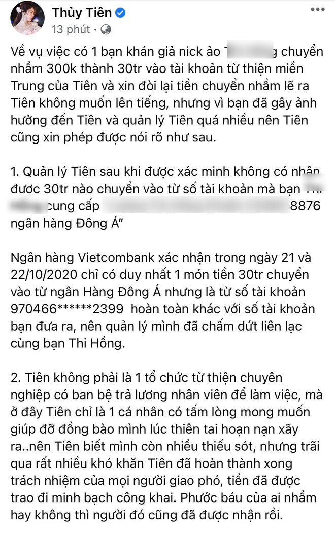 Về vụ việc có 1 bạn khán giả nick ảo T.H chuyển nhầm 300 nghìn thành 30 triệu vào tài khoản từ thiện miền Trung của Tiên và xin đòi lại tiền chuyển nhầm lẽ ra Tiên không muốn lên tiếng, nhưng vì bạn đã gây ảnh hưởng đến Tiên và quản lý Tiên quá nhiều nên Tiên cũng xin phép được nói rõ như sau.