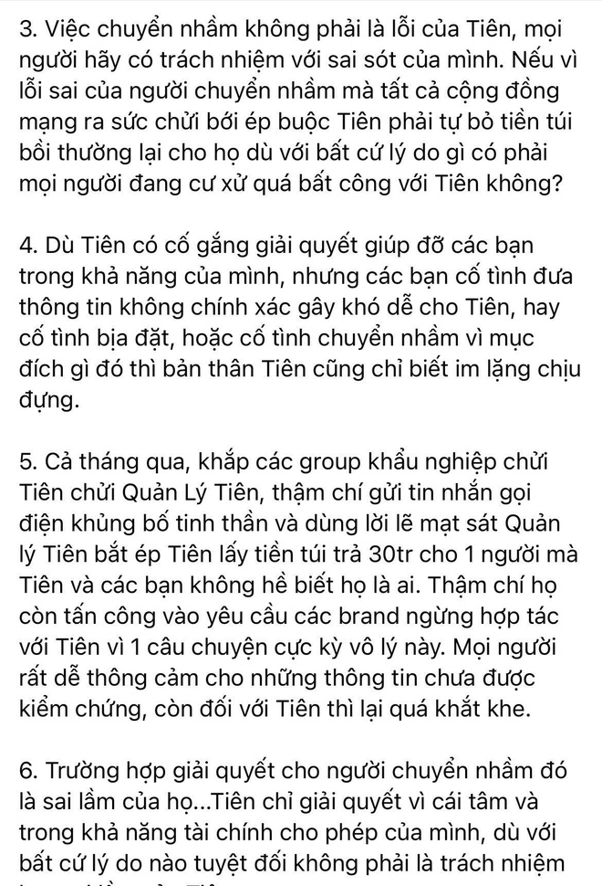 5. Cả tháng qua, khắp các group khẩu nghiệp chửi Tiên chửi quản Lý Tiên, thậm chí gửi tin nhắn gọi điện khủng bố tinh thần và dùng lời lẽ mạt sát quản lý Tiên bắt ép Tiên lấy tiền túi trả 30 triệu cho 1 người mà Tiên và các bạn không hề biết họ là ai. Thậm chí họ còn tấn công vào yêu cầu các brand ngừng hợp tác với Tiên vì 1 câu chuyện cực kỳ vô lý này. Mọi người rất dễ thông cảm cho những thông tin chưa được kiểm chứng, còn đối với Tiên thì lại quá khắt khe.