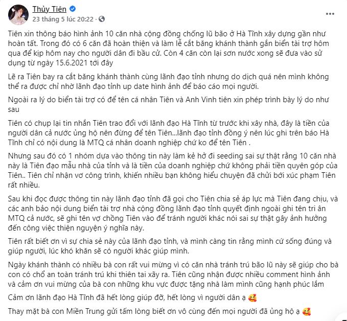 Mới đây, bà xã Công Vinh tiếp tục cập nhật tiến độ xây dựng nhà chống lũ, trong đó 6 căn đã hoàn thiện và 4 căn sẽ được đưa vào sử dụng vào tháng 6 tới đây. Dù đã đăng tải hình ảnh cũng như thông tin rõ ràng nhưng dưới phần bình luận, vẫn có không ít ý kiến trái chiều nhắm đến Thủy Tiên, cho rằng nữ ca sĩ xây dựng nhà chống lũ là vô ích vì mấy năm lũ mới đến một lần.
