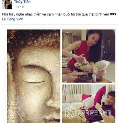 Mới đây, Thủy Tiên chia sẻ trên trang cá nhân khoảnh khắc thư giãn hiếm hoi của hai vợ chồng, khiến người hâm mộ không khỏi ngưỡng mộ pha lẫn ghen tị. Trong không gian thư thái của nhạc thiền, hai vợ chồng ngồi bình yên trên ghế sô pha, Thủy Tiên lặng lẽ pha trà để cặp đôi cùng nhâm nhi, tận hưởng buổi tối bên nhau.