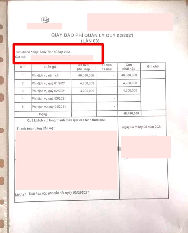 Ngoài việc phủ nhận từng mượn nợ đồng nghiệp, Thủy Tiên cũng lên tiếng đáp trả thông tin nợ phí dịch vụ suốt nhiều năm không đóng. Theo đó, hiện tại netizen đang đào lại sự việc cách đây 3 năm, trên mạng xã hội xuất hiện bài đăng Thủy Tiên - Công Vinh nợ gần 50 triệu phí dịch vụ bao gồm vệ sinh, bảo vệ ở khu biệt thự tại Quận 7, TP.HCM trong 18 tháng mà không trả. Thời điểm đó, Thủy Tiên và Công Vinh đều giữ im lặng. Đến nay, khi một cư dân mạng nhắc nhở làm rõ thông tin vụ này thì nữ ca sĩ đáp trả: "Nợ phí thì cắt điện nước bạn ơi, lo chuyện nhà mình đi, đi khẩu nghiệp hoài mất phúc".