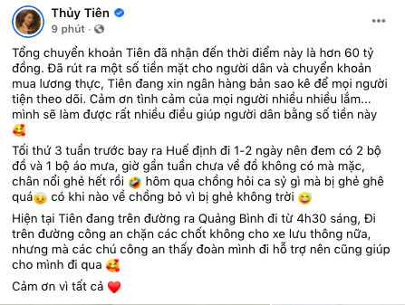 "Tổng chuyển khoản Tiên đã nhận đến thời điểm này là hơn 60 tỷ đồng. Đã rút ra một số tiền mặt cho người dân và chuyển khoản mua lương thực, Tiên đang xin ngân hàng bản sao kê để mọi người tiện theo dõi. Cảm ơn tình cảm của mọi người nhiều nhiều lắm... mình sẽ làm được rất nhiều điều giúp người dân bằng số tiền này", Thủy Tiên chia sẻ.