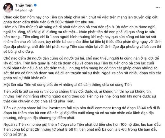 Trước đó, từng có khoảng thời gian Thủy Tiên dính phải hàng loạt ồn ào về chuyện từ thiện khi đi cứu trợ. Ngay cả như mới đây, cô vẫn phải đính chính sau khi bị nghi ngờ phát tiền từ thiện thiếu cho bà con miền Trung. Cô cho biết rằng cô đi phát tiền từ sáng sớm, nếu có sai sót chắc chắn bà con sẽ lên tiếng và bản thân cô sẽ bù tiền nếu thiếu.
