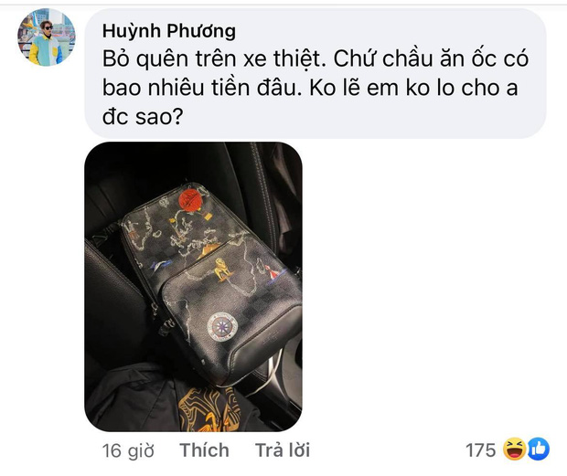 Đáng nói, Huỳnh Phương cũng chẳng chịu để yên mà tung nóng bằng chứng anh quên ví thật chứ không phải cố tình ngó lơ Tiến Luật: "Bỏ quên trên xe thiệt. Chứ chầu ăn ốc có bao nhiêu tiền đâu. Không lẽ em không lo cho anh được sao?".