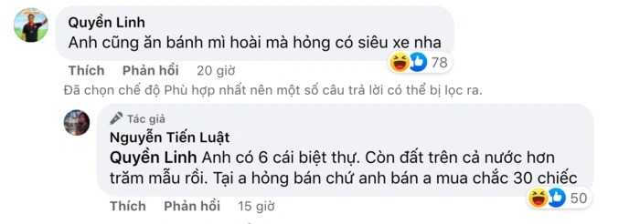 Bên dưới bài đăng, ngoài những bình luận từ bạn bè, đồng nghiệp lẫn khán giả thì còn có sự tham gia của "MC quốc dân Quyền Linh". Theo đó "ông mai" Quyền Linh đặt thắc mắc: "Anh cũng ăn bánh mì hoài mà không có siêu xe nha".