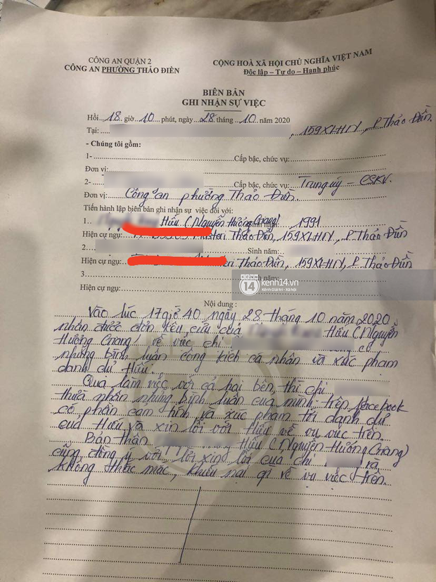04/11/2020 14:05Tiết lộ biên bản ghi nhận việc công an và Hương Giang đến nhà antifan làm việc
