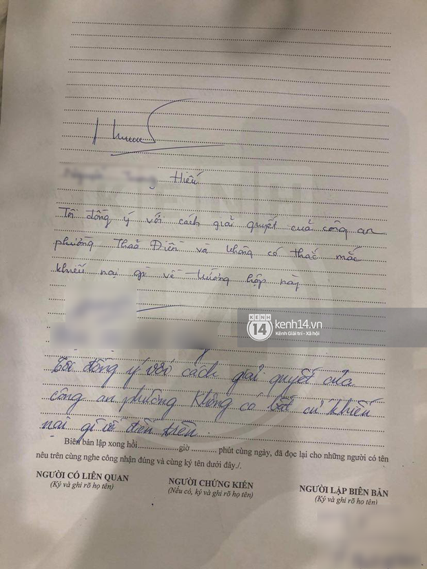 Trước sự chứng kiến của cơ quan chức năng, Hương Giang và antifan V cùng ghi trong biên bản: "Tôi đồng ý với cách giải quyết của cơ quan chức năng và không có thắc mắc hay khiếu nại về trường hợp này".
