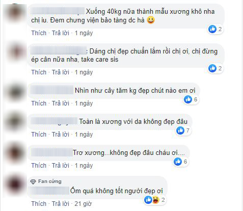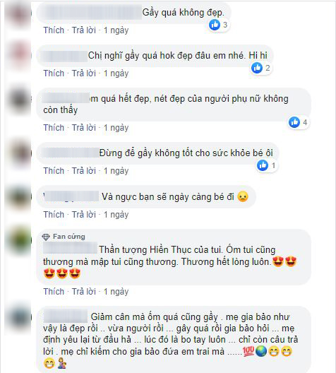 Chứng kiến hình ảnh này của Hiền Thục, nhiều người đã tỏ ra vô cùng tiếc nuối với vóc dáng đầy đặn khỏe khoắn, tràn đầy sức sống của cô trước kia. Rất nhiều bạn bè cũng như người hâm mộ đã để lại bình luận khuyên Hiền Thục nên chú ý chăm sóc sức khỏe, không nên giảm cân quá đà bởi rất có thể sẽ ảnh hưởng không tốt đến cơ thể của cô.
