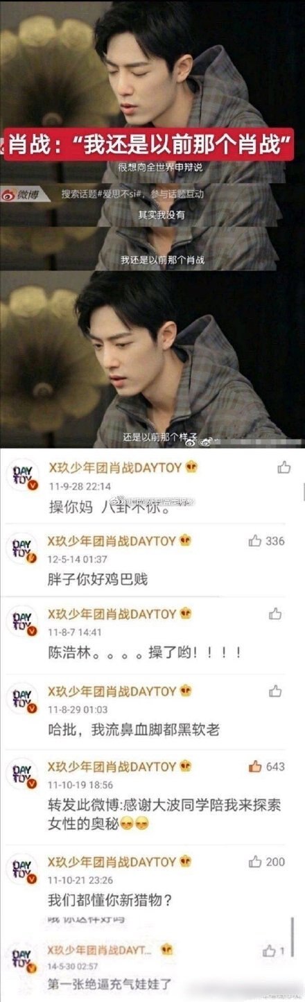 Và mới đây nhất, sau phốt fandom tạo ra thì dân mạng đã đào lại tài khoản cũ, bài phỏng vấn năm xưa của Tiêu Chiến và phát hiện chính miệng nam diễn viên đã từng nói: “Thực ra tôi vẫn là Tiêu Chiến của trước đây“. Thế nhưng, Tiêu Chiến của trước đây lại bị dân mạng bóc phốt là người ăn nói thô tục, có lời lẽ khiếm nhã như: “Đ*t mẹ mày (fuck your mom) bọn bát quái”, “Cảm ơn bạn Đại Ba đã giúp tôi tìm kiếm nơi huyền bí của phụ nữ”, “Cặn bã”.