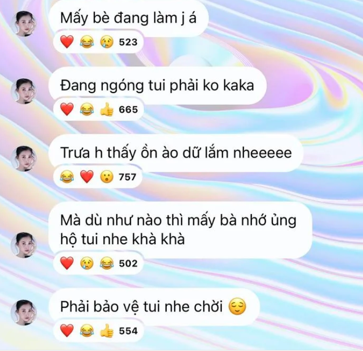 Trong nhóm chat Instagram với hơn 30 nghìn fan, nàng hậu "lửa hận thù" chia sẻ: "Trưa giờ thấy ồn ào dữ lắm. Mà dù như thế nào thì mọi người nhớ ủng hộ tôi nha. Phải bảo vệ tôi nhé".