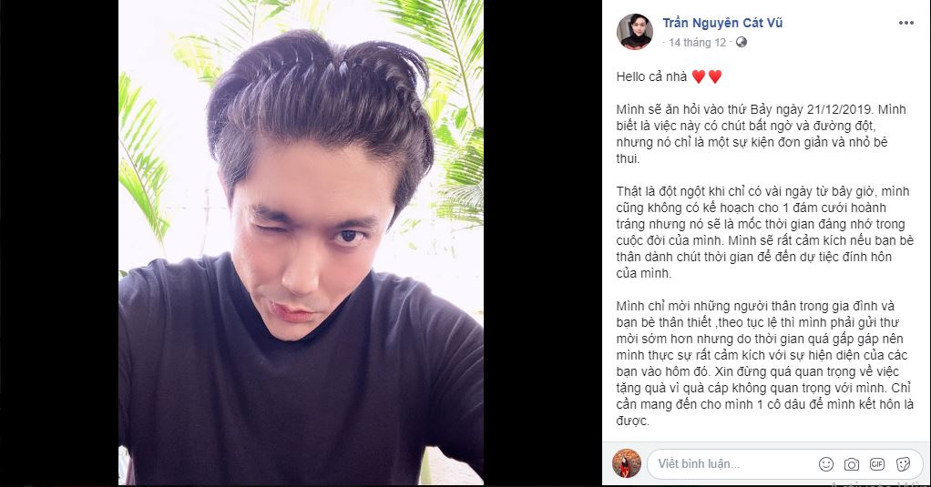 Tim viết: "Mình sẽ ăn hỏi vào thứ bảy ngày 21/12/2019. Mình biết là việc này có chút bất ngờ và đường đột, nhưng nó chỉ là một sự kiện đơn giản và nhỏ bé thui.