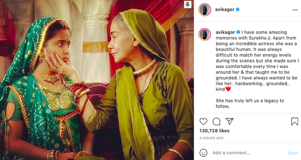 Sau khi thông tin này được chia sẻ, Avika Gor - sao nữ đảm nhiệm vai diễn Anandi ngày nhỏ đã đăng bài viết bày tỏ nỗi lòng xót xa vì sự ra đi mất mát này của ngôi sao gạo cội: "Tôi đã có rất nhiều kỷ niệm tuyệt vời bên bà Surekha. Không chỉ là một diễn viên tuyệt vời mà bà còn là một người phụ nữ xinh đẹp. Quả thật tôi rất khó có thể theo kịp năng lượng của bà trong mỗi cảnh quay, vậy nhưng bà Surekha vẫn luôn tạo cảm giác thoải mái và chỉ bảo tận tình cho tôi. Tôi thực sự rất muốn trở thành người như bà... chăm chỉ, tốt bụng và tử tế. Dadisa, con luôn yêu bà, thiên thần hộ mệnh của con".