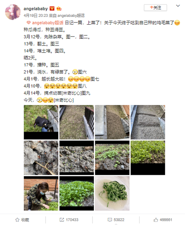 Ít ngày trước, Angelababy đã chia sẻ loạt ảnh ghi lại khoảnh khắc cô tự tay gieo hạt, nhổ cỏ và tưới nước cho cây. Con trai Bọt Biển Nhỏ cũng phụ giúp mẹ chăm sóc vườn nhà.
