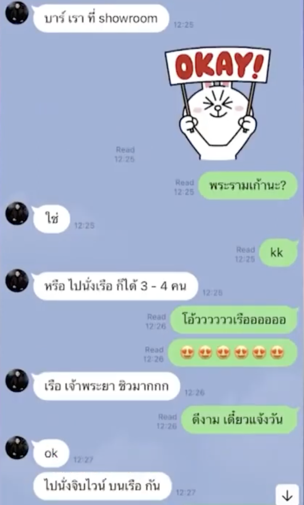 Por đã cho MC Nhoom xem thêm 1 đoạn tin nhắn với nhóm bạn, khẳng định tất cả đều quen biết nhau chứ không phải tiếp khách như lời đồn. Sau đoạn hội thoại đối chứng, MC Nhoom kết luận rằng tin đồn nữ quản lý lừa Tangmo Nida lên thuyền tiếp đại gia là sai sự thật.