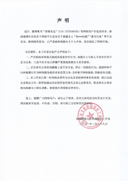 Phòng làm việc của Angelababy cho biết đây là 1 tin đồn ác ý không đúng sự thật. Bên cạnh đó, phía phòng làm việc của Angelababy còn khẳng định, cô không có bất kỳ mối quan hệ không chính đáng nào với người khác, đồng thời yêu cầu những phát ngôn sai sự thật phải nhanh chóng xóa bỏ.