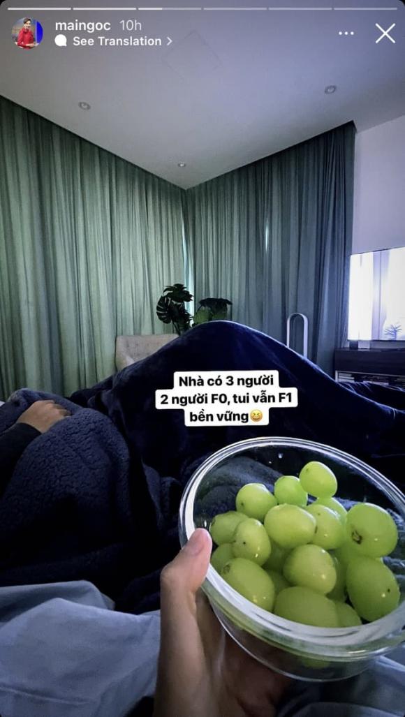 Mai Ngọc viết: "Cả ngày cả đêm chăm F0, sáng nay test vẫn 1 vạch", lúc lại tung hình ung dung thưởng thức cả bát nho xanh căng mọng và tự tin: "Nhà có 2 người F0, tui vẫn F1 bền vững". Cô còn không quên tự động viên mình: "Mãi là F1 thôi nhé!".