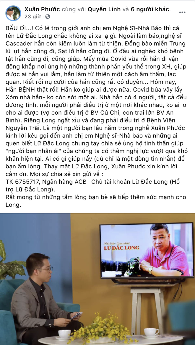 Không chỉ thế, hội nghệ sĩ còn thường xuyên dõi theo và cập nhật diễn biến bệnh của Lữ Đắc Long, 1 lòng cầu nguyện và hướng về gia đình người đồng nghiệp không may bị nhiễm bệnh. Nổi bật nhất, chính NS Quyền Linh đã mang đồ đến tận bệnh viện và nhanh chóng cùng người thân tương trợ cho gia đình người đồng nghiệp thân thiết.
