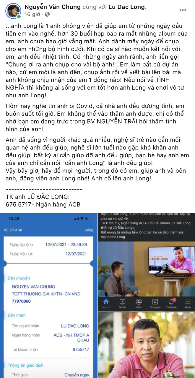 Trong lúc này, ai cũng gặp khó khăn, chúng ta không thể làm những điều lớn lao nhưng có thể làm việc nhỏ với tình yêu lớn. Hàng loạt nghệ sĩ đã góp mỗi người 1 vài triệu, có cả công khai và âm thầm để gia đình Lữ Đắc Long an tâm chiến đấu với Covid-19.