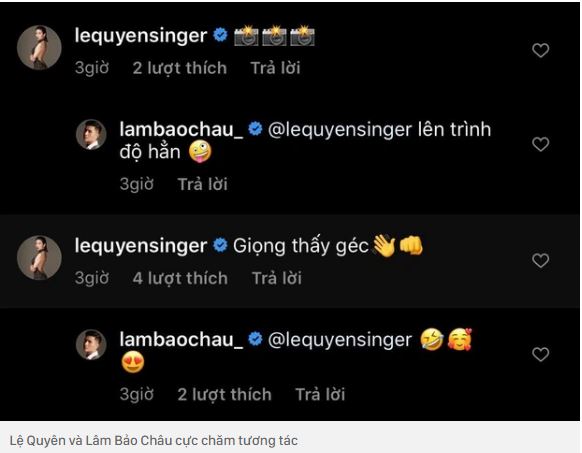 Nhưng đáng kể nhất là phần đối đáp của trai trẻ và chị đẹp ở bình luận. Theo đó Lệ Quyên hết thả icon cho biết mình là người đứng sau những bức hình lại buông lời hờn dỗi: "Giọng thấy géc". Đáp lại, Lâm Bảo Châu lại khen nửa kia: "Lên trình độ hẳn". Cả hai không quên đính kèm vài chiếc icon cho rõ ràng cảm xúc.