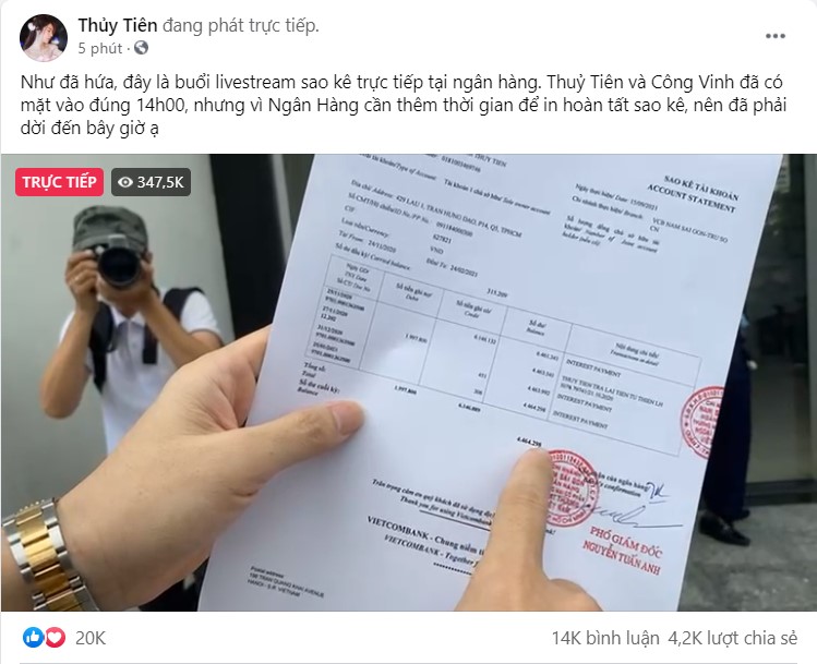 Sau khi có mặt tại ngân hàng Vietcombank để làm thủ tục nhận sao kê vào 14h ngày 17/9, vợ chồng Thủy Tiên - Công Vinh đã chính thức livestream làm rõ toàn bộ những điểm nghi vấn về số tiền 177 tỷ mà các mạnh thường quân quyên góp cho đợt cứu trợ miền Trung năm ngoái.