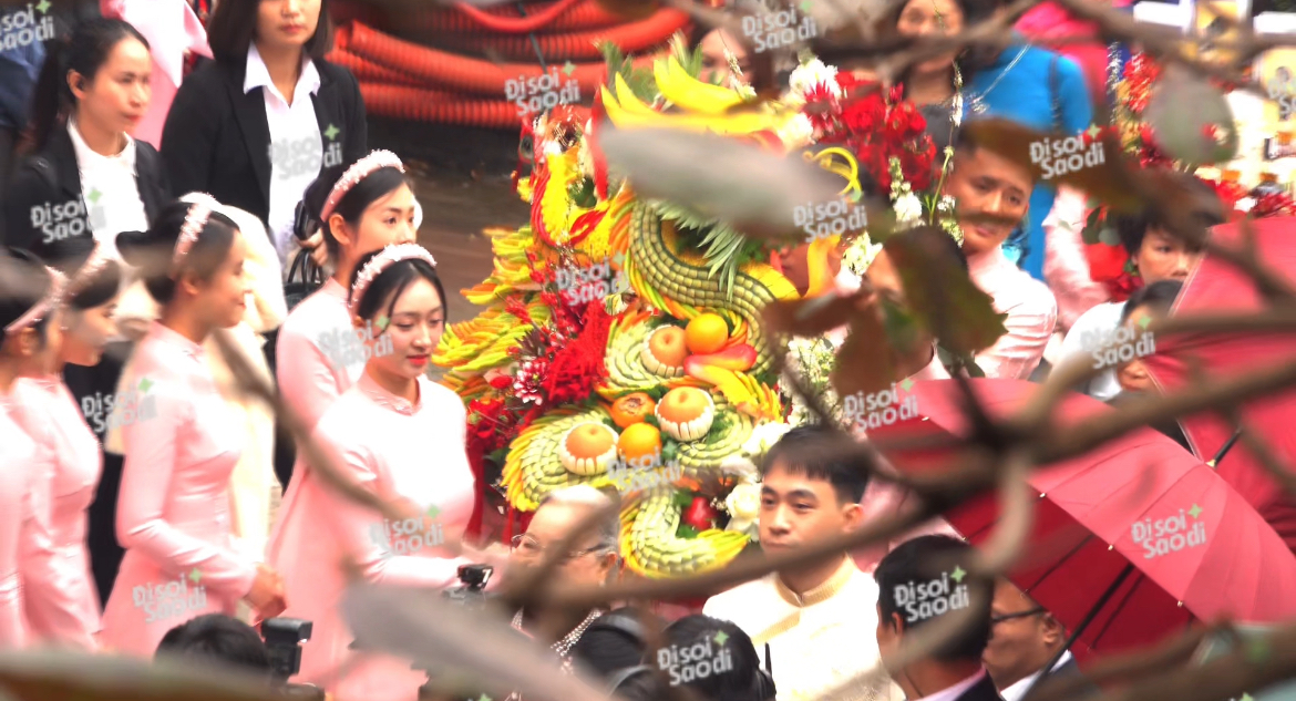 Người ta có câu sính lễ chính là thể hiện lòng thành của nhà trai dành cho gia đình cô dâu. Nhà thiếu gia Minh Hoàng mang 9 mâm lễ vật, được bày trí tỉ mỉ, sang trọng và vô cùng hoành tráng đến trao cho gia đình cô dâu. Bên ngoài nhà riêng của Phương Nhi, dàn xe bóng loáng, xếp hàng ngay ngắn đợi sẵn để hộ tống nàng hậu về làm dâu tỷ phú.